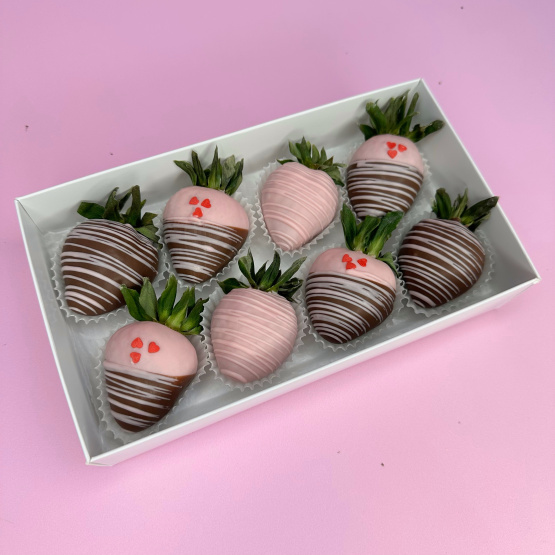 Состав: клубника в шоколаде 8 шт.  Коробочка свежей клубники в фирменном шоколаде — воплощение нежности и любви. В её основе — сочные ягоды отборной клубники Альбион, каждая из которых вручную окутана бархатистым шоколадом и украшена изящными посыпками. Это безупречный подарок для самого романтичного дня в году — 14 февраля (Дня Святого Валентина). Такой знак внимания станет прекрасным дополнением к букету, создав идеальную гармонию роскоши и чувственности. А в качестве самостоятельного презента это сильное и запоминающееся признание, которое останется в сердце надолго. Идеальная валентинка для самой особенной женщины: любимой, жены, подруги, мамы или дочери. Не забывайте и о мужчинах, ведь им тоже приятно получить такой подарок: любимому мужчине, парню, другу, мужу. Дарите вкус, перед которым невозможно устоять.