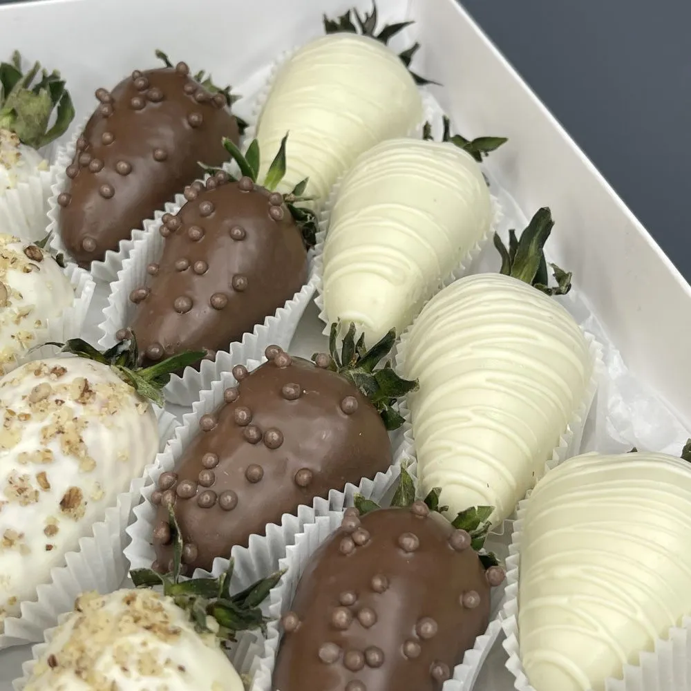 Мы собираем клубничные букеты по весу, а не по штукам. Количество, форма и размер ягод могут отличаться — ведь каждая ягода уникальна.
