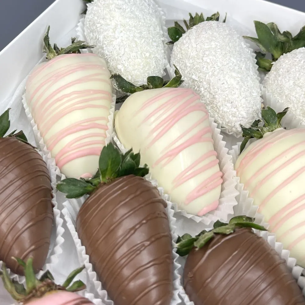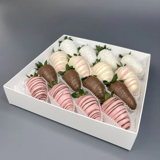 Мы собираем клубничные букеты по весу, а не по штукам. Количество, форма и размер ягод могут отличаться — ведь каждая ягода уникальна.