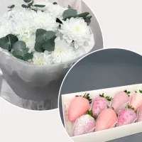 Состав: клубника в шоколаде 200 г, хризантема кустовая 3 шт., эвкалипт 2 шт.  Подарочный набор — идеальный способ выразить чувства: ко дню рождения, годовщине, 8 Марта, 14 Февраля, Дню матери, Дню учителя, Дню бабушки и дедушки или просто в знак внимания и заботы. Это отличный подарок бабушке, маме, любимой женщине, жене, подруге, сестре, друзьям и коллеге. Фирменная открытка-инструкция по хранению — в подарок.