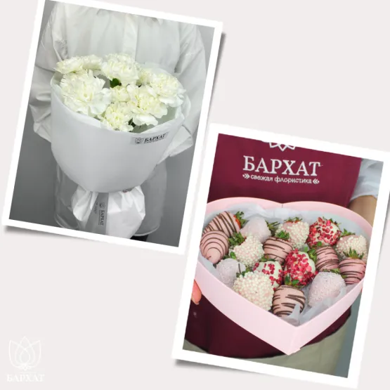 Мы собираем клубничные букеты по весу, а не по штукам. Количество, форма и размер ягод могут отличаться — ведь каждая ягода уникальна.