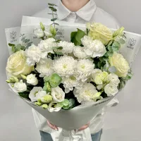 Состав: хризантема кустовая белая 1 шт., роза одноголовая белая 3 шт., эустома белая 4 шт., гвоздика белая 4 шт., эвкалипт 1 шт. Букет из свежих цветов — идеальный способ выразить чувства: ко дню рождения, годовщине, 8 Марта, 14 Февраля, Дню матери, Дню учителя, Дню бабушки и дедушки или просто в знак внимания и заботы. Фирменная открытка-инструкция по хранению — в подарок. Цветочный букет — отличный подарок бабушке, маме, любимой женщине, жене, подруге, сестре, друзьям и коллеге.