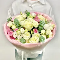 Роза одноголовая белая, Роза кустовая белая, Эвкалипт, Роза кустовая розовая, Эустома