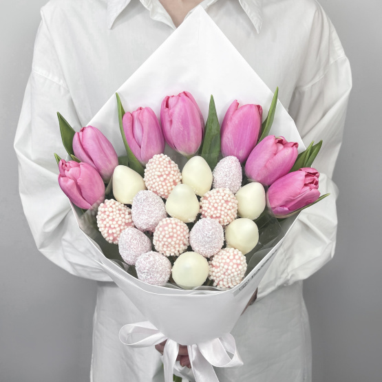 Этот букет — идеальный способ выразить чувства: ко дню рождения, годовщине, 8 Марта, 14 Февраля, Дню матери, Дню учителя, Дню бабушки и дедушки или просто в знак внимания и заботы. Букет из клубники и цветов — съедобный букет — отличный подарок бабушке, маме, любимой женщине, жене, подруге, сестре, друзьям и коллеге.