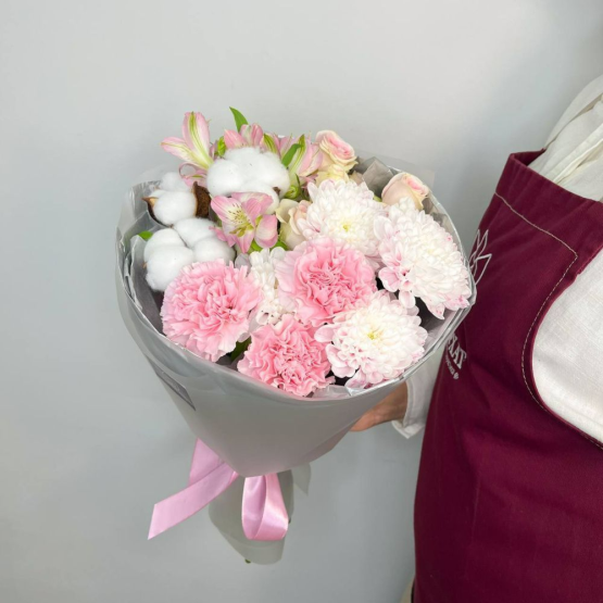 Состав: хризантема кустовая 1 шт., альстромерия 2 шт., гвоздика 3 шт., роза кустовая 1 шт., хлопок 3 шт. Букет из свежих цветов — идеальный способ выразить чувства: ко дню рождения, годовщине, 8 Марта, 14 Февраля, Дню матери, Дню учителя, Дню бабушки и дедушки или просто в знак внимания и заботы. Фирменная открытка-инструкция по хранению — в подарок. Цветочный букет — отличный подарок бабушке, маме, любимой женщине, жене, подруге, сестре, друзьям и коллеге.