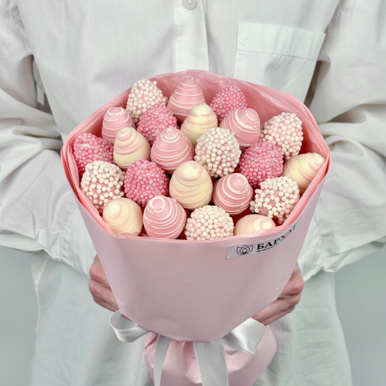 *Обратите внимание: изображение в карточке товара носит иллюстративный характер — реальный букет может незначительно отличаться от фото (например, по размеру клубники, форме и сборке). Точные размеры букета указаны в карточке товара.