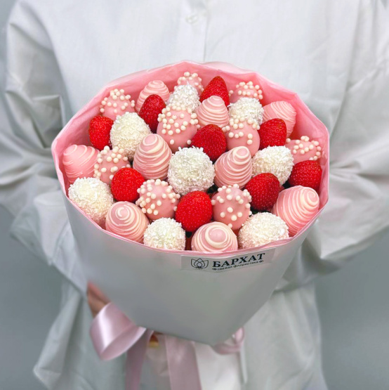 *Обратите внимание: изображение в карточке товара носит иллюстративный характер — реальный букет может незначительно отличаться от фото (например, по размеру клубники, форме и сборке). Точные размеры букета указаны в карточке товара.